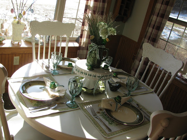 Well my dear friend, you have gone and done it again! This is a gorgeous St Pat's Day table...and you say that you don't have much green! It looks really beautiful in your home!!! My goodness, for just $5...you pulled a beautiful table out! I love those dishes...you know, I have been scoping them out! Hehe! I have the placemats and napkins that go with that set...but no dishes! Hehe! Now if we lived closer together...we could "pool" all of our goodies! Anyway, love your place settings with all those little extras! Girlfriend, I love, love, LOVE that floral bouquet...it's so pretty and just perfect for your green table! Love all of your St. Pat's Day decorations! I spy a few right in the bouquet...too cute! You know that I just adore your pretty pedestal cake plate! It's so fun to be able to change out the ribbons, isn't it! Well dear lass...I love your table! You did GOOD!!!