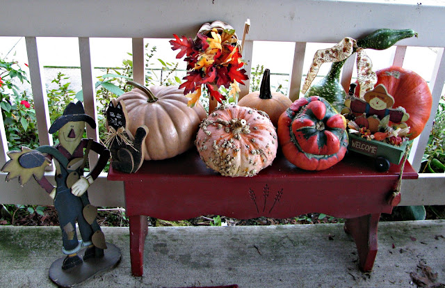 Beautiful fall pics and the pumpkins are so pretty. I've never seen those warty looking ones-I like them. You're little red bench is so cute decorated up for fall. Thanks for all the pumpkin pics!