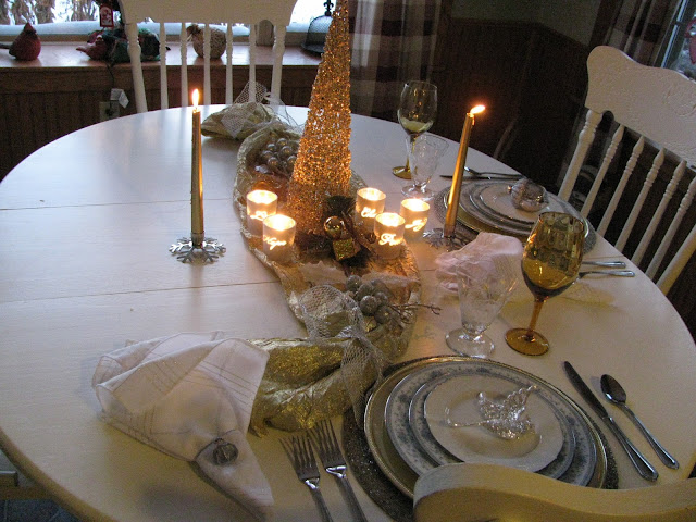 ReplyDeleteCindy, Your table is lovely. I like the table itself and the view out the window too. Love your votives, your gold tree, the etched glasses and the gold glasses. Love your china too. Cindy, this is an elegant table.