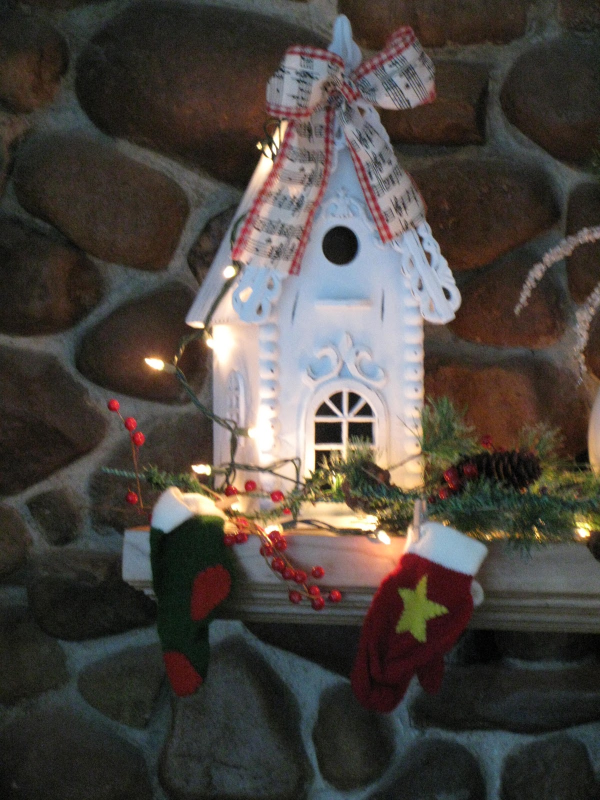 What a cute picture! I'd say you did get the best present of all this year! The mantel looks pretty, love the birdhouse...it glows!