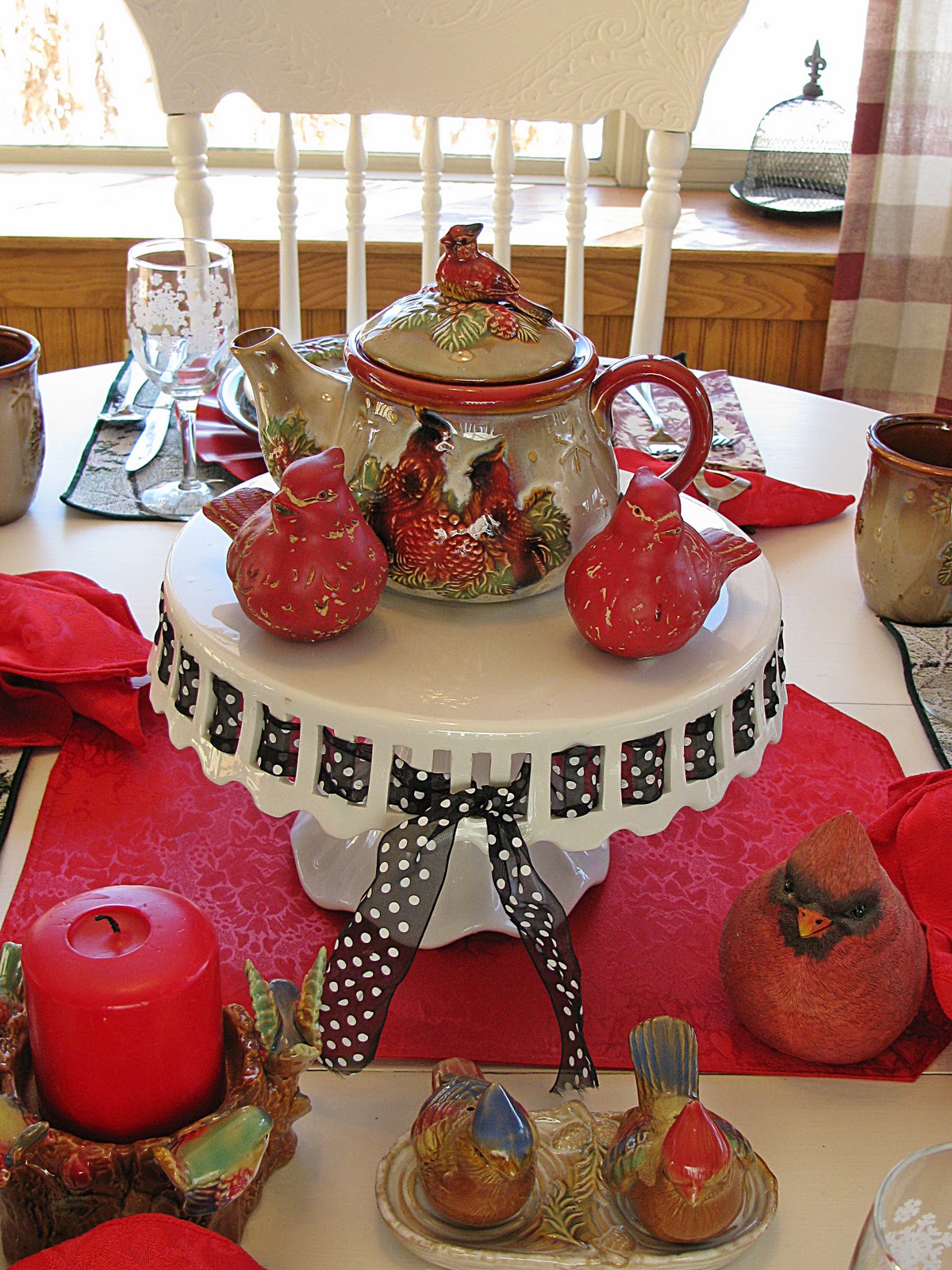 ReplyDeleteYour red cardinal teapot is so cute! I love cardinals. Your tablescape looks wonderful with that beautiful snowy backdrop. I am glad you are staying warm. This So. Cal. girl would not be doing to well! LOL! Take care! Hugs!